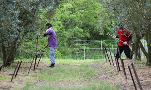 オリーブ畑で、 男性スタッフの腰辺りまで伸びた、雑草。 今日の気温は日中25度と予報されている小豆島では 農園…