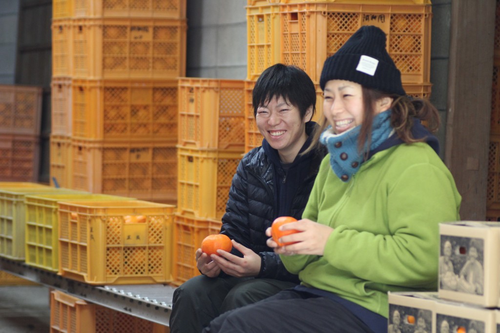 選果小屋で休憩中の女性スタッフ久山さんと佐藤さん^^