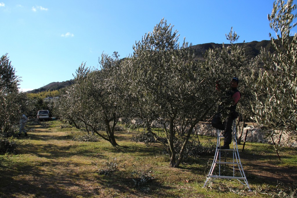 農園スタッフたちがオリーブの剪定作業を行っていました。