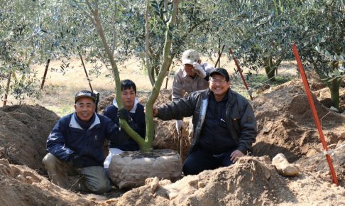 男性スタッフ4人とオリーブの木がすっぽりと入るくらいの