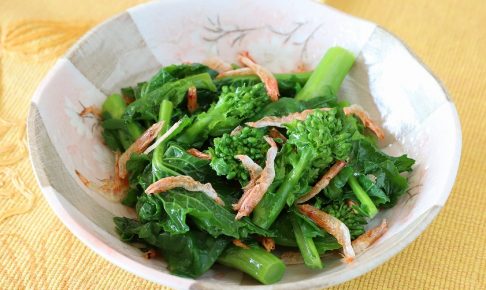 ■材料(2人分) ●菜の花:3束 ●干し桜エビ:大さじ1 ●緑果オリーブオイル:大さじ2 ●オリーブ香草塩:少…