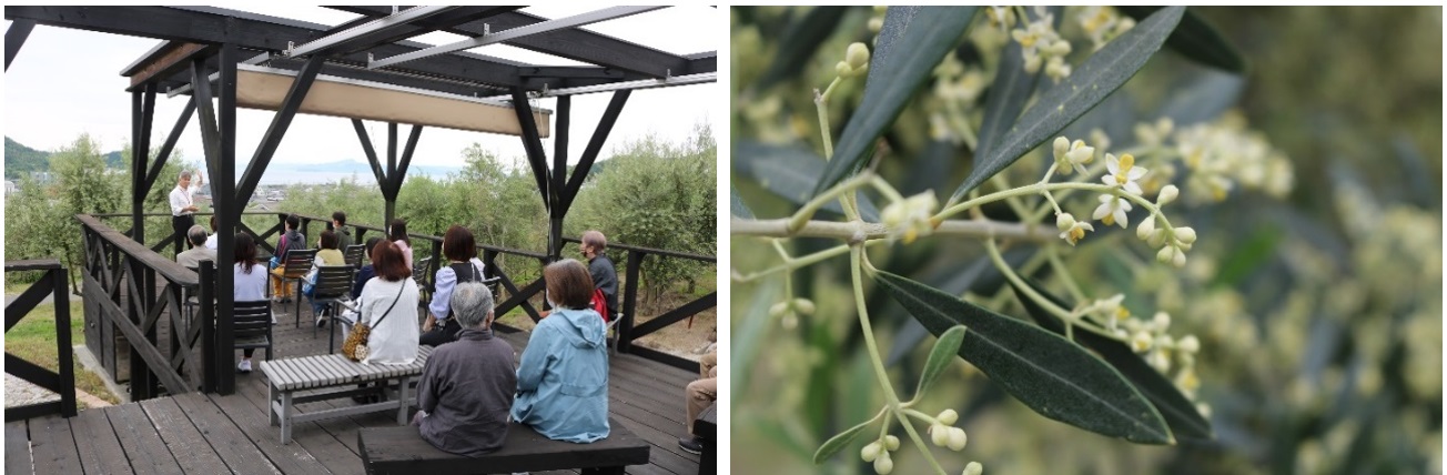 ここには、井上誠耕園が初めて植えたオリーブの木もある始まりの畑「本園」があり、今の季節はオリーブが小さなつぼみや花をつけて風に揺れる、穏やかな景色が楽しめます。