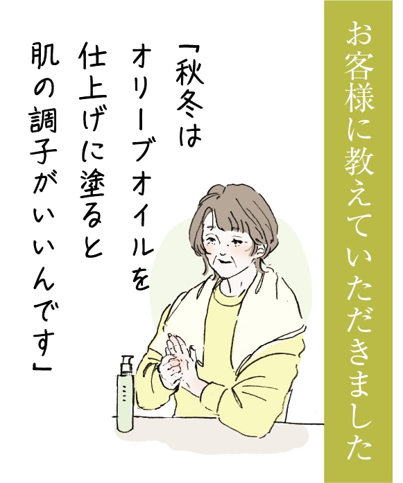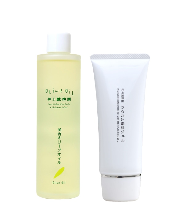 美容オリーブオイルを1滴仕上げに塗ってもよし、うるおい素肌ジェルに美容オリーブオイルを混ぜて使ってもよし◎秋冬の乾燥する季節に、しっかり保湿してくれるおすすめのセットです。