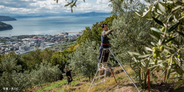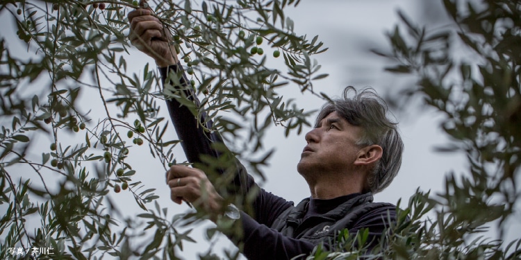 私たち井上誠耕園の畑でオリーブを栽培し始めたのは、昭和21年。もともと熟す前の緑色の果実は新漬け用として収穫をしていました。熟し具合で味が変わるオリーブは上下左右から木を見ながら畑中を何度も回り、ここぞという時期を絶対に逃すことなく収穫をしなければなりません。それが2代目園主である父親の教えでした。私は父親と共にオリーブと向き合う日々の中で、オリーブオイルも新漬けのように、熟度によっておいしさも違うのではないかと考えたのです、当時オイル用に搾っていたのは完熟した果実ですが、熟す前の緑果を試しに搾ってみたところ、完熟した実にはないパンチがあり、思わず唸るような個性的なおいしさでした。収穫時期が早すぎれば辛みが強すぎ、反対に遅ければ熟してまろやかになるオリーブオイル。
