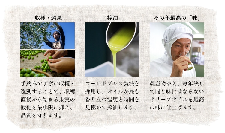 農産物であるオリーブオイルは毎年、味や香りが異なります。その年ならではの味わいをお楽しみいただければ幸いです。