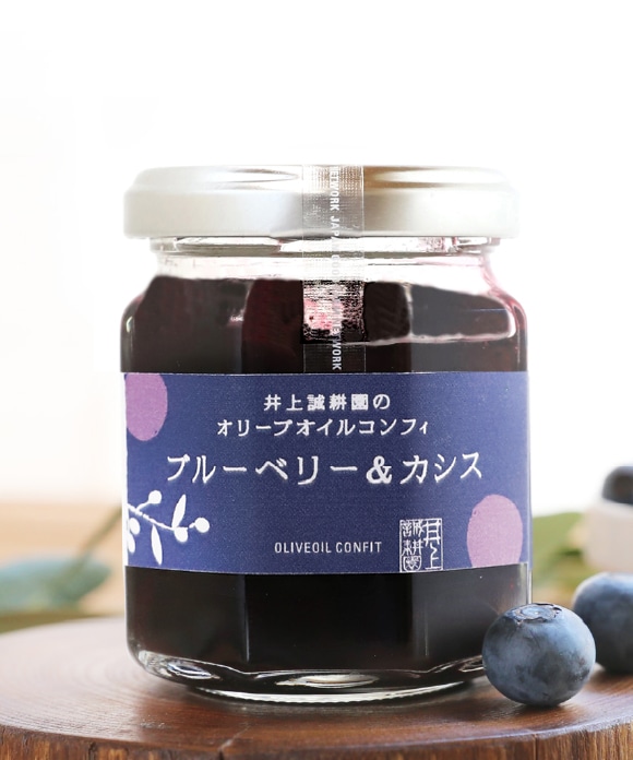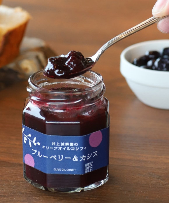 旬のブルーベリーとカシスでつくった甘酸っぱいジャムを、井上誠耕園自慢の「エキストラヴァージン完熟オリーブオイル」で漬け込んだのが「オリーブオイルコンフィ ブルーベリー&カシス」です。採れたての旬の美味しさを求めて、たどり着いたのがブルーベリー、カシス栽培に適した冷涼な青森の地でした。出会った2軒の農家がつくる、新鮮な果実を小豆島に持ち帰り、ジャム工房でじっくり炊きあげた季節限定の美味しさです。