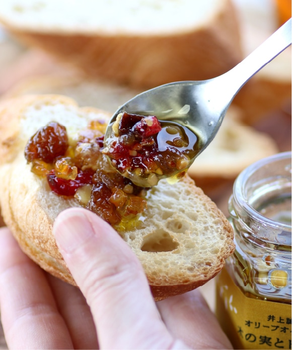 ほんのり甘くて、朝食にぴったりなオリーブオイルコンフィ「木の実とドライ果実」。ゴロゴロ入った木の実とドライ果実は、大きすぎず小さすぎず、ちょうど良い大きさ。異なる食感が楽しめます。