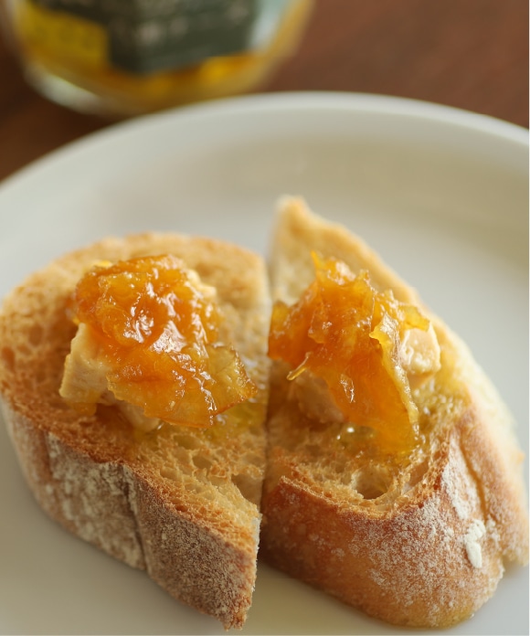 私たちが大切に育てた八朔の皮でマーマレードを作り、クリームチーズと一緒にオリーブオイルに漬けました。八朔のほろ苦い甘さとチーズの濃厚な旨みが口いっぱいに広がります。