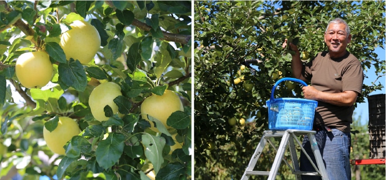 「王林」と「はつあき」を交配育成した品種で、その姿から「黄色い王様」すなわち『きおう』と名付けられました。「きおう」を育てる桜庭農園での中でも最も早くに旬を迎える早生品種です。「黄色い王様」という名前の通り、大きくて立派なりんごは味もピカイチです。果肉は固め、噛むたびシャキシャキと歯触りよく、甘みと酸味のバランスがとれた美味しさです。