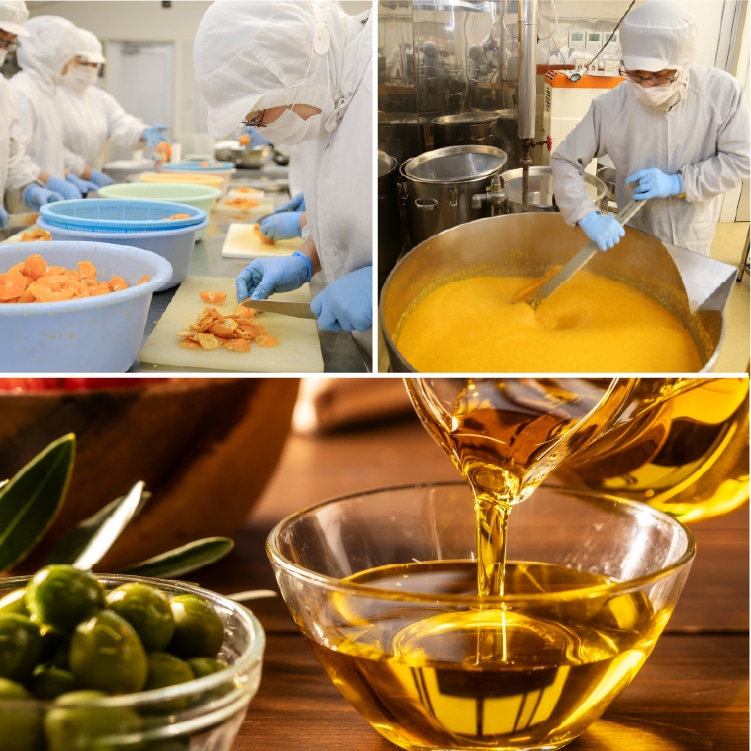 小豆島にあるジャム工房では、熟練のスタッフが1つずつ丁寧に果実の下処理を行っています。雑味のもととなる果実の芯や、傷んだ部分などは細かく取り除き、火加減を調整しながらコトコト炊きあげています。さらに、仕上げに加えるのは井上誠耕園の「ライムオリーブオイル」です。新鮮なライムとオリーブを一緒に生搾りすることで華やかな香りが溶け込んでいます。みかんとりんごの濃厚な甘みに、ライムの爽やかな香りが加わって、爽やかなおいしさが口いっぱいに広がります。