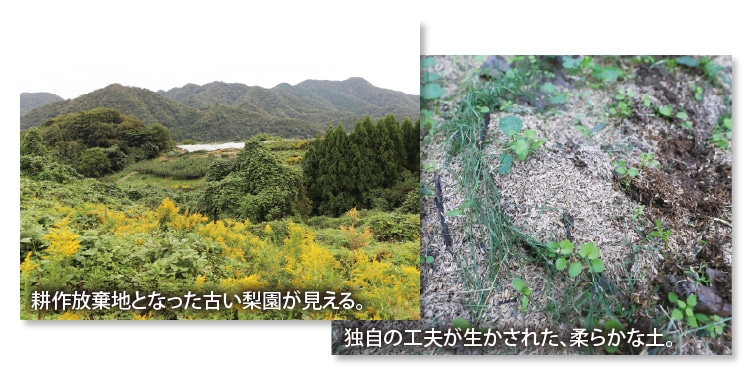発酵させた枯草ともみ殻を混ぜた自然由来の独自の堆肥に、水はけをよくする排水の工夫で、梨の木の根が張りやすい土を作っているそう。この堆肥作りは祖父の代から受け継がれているとのことで、「父が元気なうちに色々ノウハウを聞きたいんです。そして、自分でも新しい梨づくりへの取り組みを考えたい」と、一平さんの思いは続きます。惜しくも放棄地になっていった古い梨園が見渡せる、傾斜地の園地。父の豊美さんが、大切に袋掛けされた果実を収穫していきます。物静かな、しかし貫禄ある背中を見ながら、一平さんが汗を流しています。いつまでも見ていたくなるような、親子の景色がそこにありました。