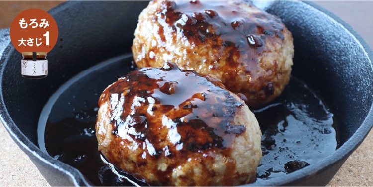 ②火が通ったらそのままのフライパンにもろみ大さじ1と水さじ1を入れて温めながらハンバーグと絡める。