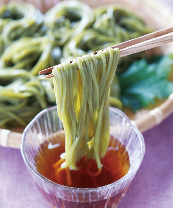 香川県伝統のさぬきうどんに、希少な井上誠耕園のオリーブ葉を練りこんだ、細うどんです。上品でまろやかな味わいの八女茶が、さらにオリーブ葉の豊かな香りを引き立てます。