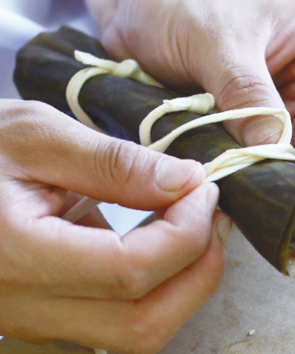 炊きあがりを考えて、昆布の根本と葉を組み合わせて1本1本手作業で巻きあげます。魚の身質によって巻きあげる力を調節しながら、煮崩れしない絶妙な具合で仕上げていきます。