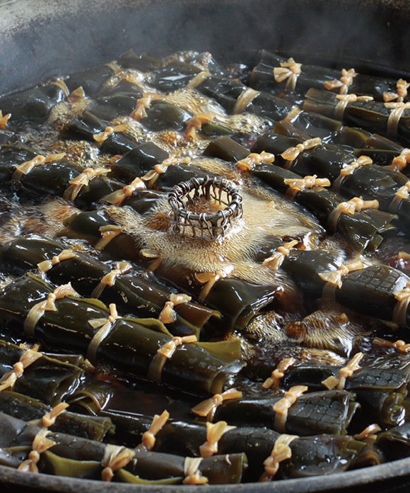 昆布の煮え具合をこまめに確かめながら、弱火でじっくり炊きあげます。使っているのは年季の入った釜。職人の祖父の代から受け継ぐ小さな直火釜を使っています。