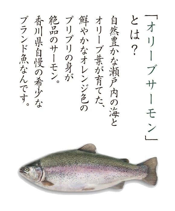 「海面養殖ニジマス」をハーブで育てた、香川県自慢の希少なブランド魚です。自然豊かな瀬戸内の海で育てた、鮮やかなオレンジ色のプリプリの身が絶品のオリーブサーモン。脂がのった上品な美味しさのオリーブサーモンは、醤油と昆布との相性が抜群なんです。