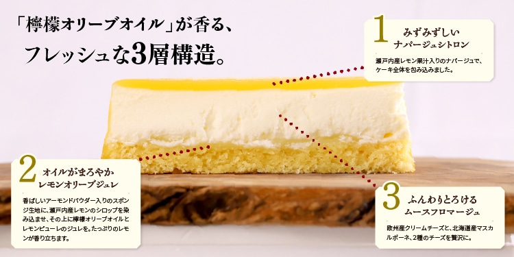 ふわふわのレアチーズを包み込むスッキリした瀬戸内レモンの果汁と、檸檬オリーブオイル。爽やかな季節の香りを散りばめました。明るい瀬戸内の日差しのように美しく、お茶の時間を彩ります。