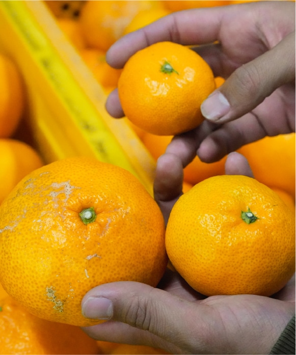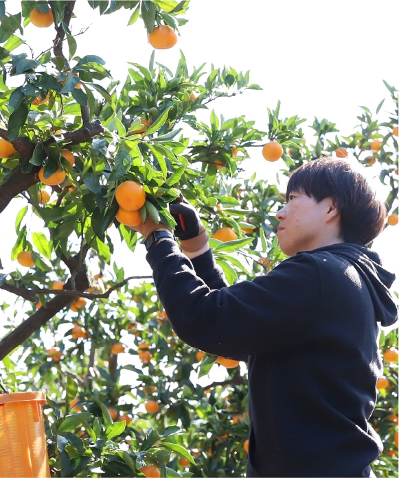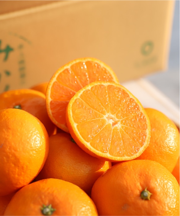 待ちに待った収穫の時期を迎えたみかん。今年は夏の猛暑の影響で、朝夕の冷え込みが遅れたため例年より10日間ほど収穫が遅れてスタートしました。例年通りにはいかない気候が続く中、夏の間の「灌水」作業、果実1つ1つの大きさに大きな影響を与える「摘果」作業など、みかんにとって厳しい環境をなんとか切り抜けようと、農園スタッフ総出で作業を行いました。 そして、やっとの思いで迎えた収穫シーズン!昨年に比べて果実は大きい傾向があり、立派なみかんが実りました。樹上で完熟させてから収穫した「木成り完熟みかん」は1粒1粒にぎゅっと甘みが集中しています。小玉サイズでも大玉サイズでもコクのある甘~い果汁をお楽しみいただけます!