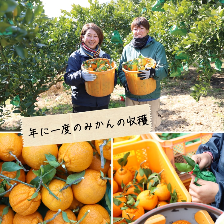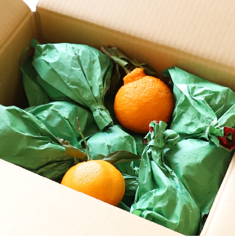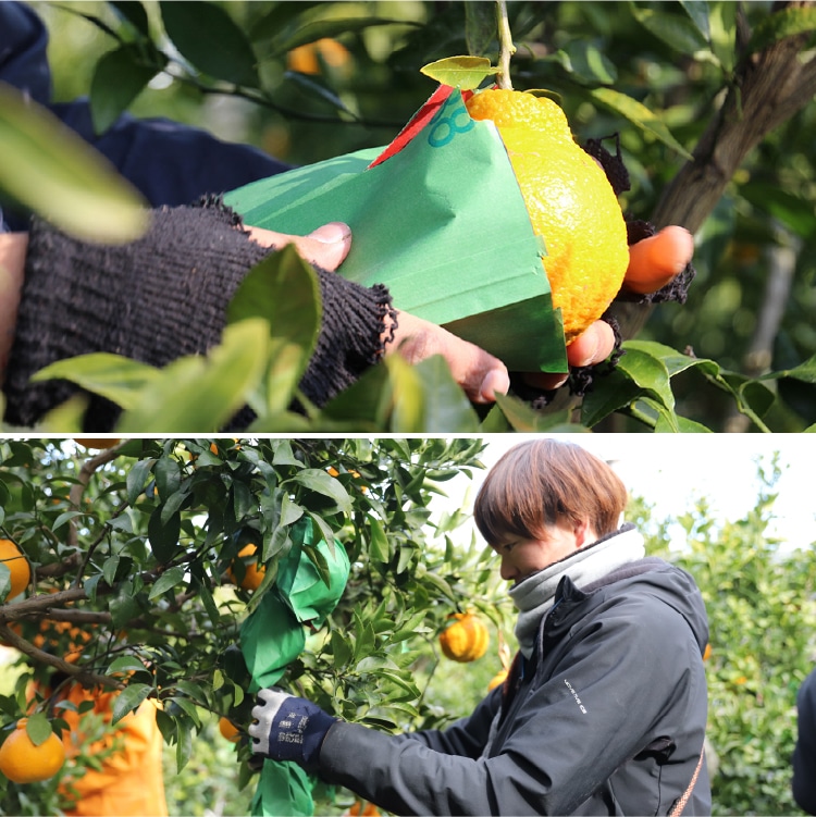 デコ柑のような中晩柑とは、農家の腕が試される柑橘です。冬に収穫した柑橘を、人の手で「貯蔵」することでおいしい食べごろを見計らってお届けします。井上誠耕園では、デコ柑本来の味わいが楽しめる上質な状態を保つために、果実に袋をかけた状態でお届けしております。