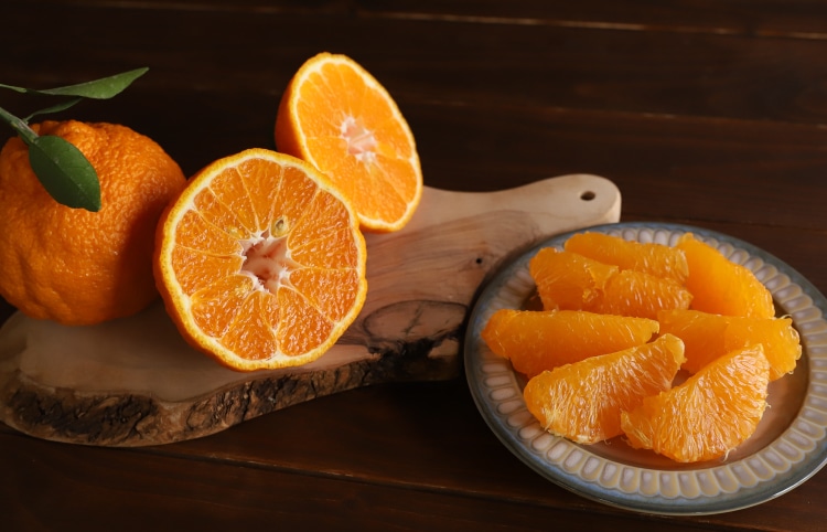 まろやかな甘味が楽しめる「ポンカン」と、酸味と甘味が絶妙なバランスの「清見オレンジ」を交配して誕生した品種。通称“不知火(しらぬい)”として親しまれている柑橘を私たちは「デコ柑」と呼んでいます。