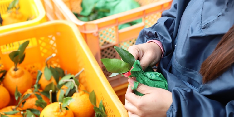 当園で育つ柑橘は、近年の温暖化や気候変動の影響から、以前に比べてカビの発生や、ヘタが取れてしまう現象が目立つようになってきました。私たちは、お客様へおいしく、そして品質の良い果実をお届けするために、令和四年より必要最低限の防カビ剤を使用させていただき、果実の品質を守っています。もちろん、国の厳しい安全基準を満たした中での使用となっておりますので、どうぞご安心してお召し上がりください