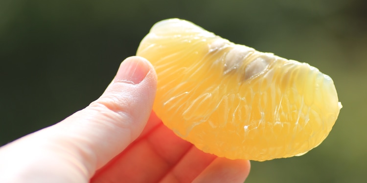 井上誠耕園が育てる文旦は「メイポメロ」という希少な品種で、生産者が少なく市場にはほとんど出回らないため「幻の柑橘」とも呼ばれています。特徴はなんといっても豊かな香りとザクっとした食感、そして酸味が少なく爽やかな甘み。外皮は厚く包丁やナイフが必要ですが、内皮と果肉は分離しやすく食べやすい果実です。