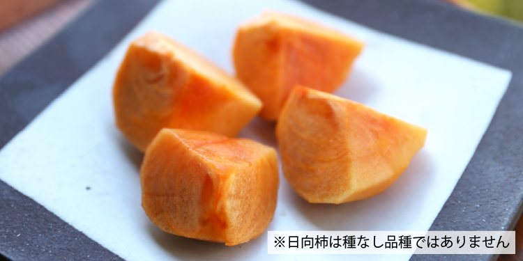 今季のひなた柿再販について 熟度が充分ではない少量の果実を加工用としての利用を考えて冷蔵貯蔵しておりましたが、一定の貯蔵期間を経た果実は予想以上に追熟し、青果として美味しく味わえる甘さと味になりました。 そこで、数量はわずかですがこのたび再販させていただくことになりました。