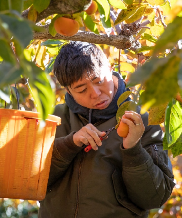 ▲写真左:親子二代で40年、柿栽培を続けてきたタケイさん