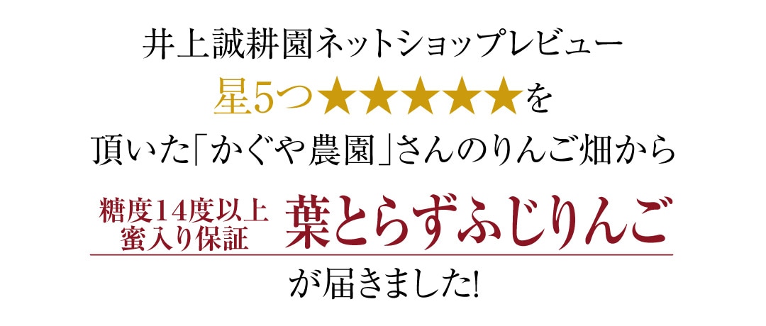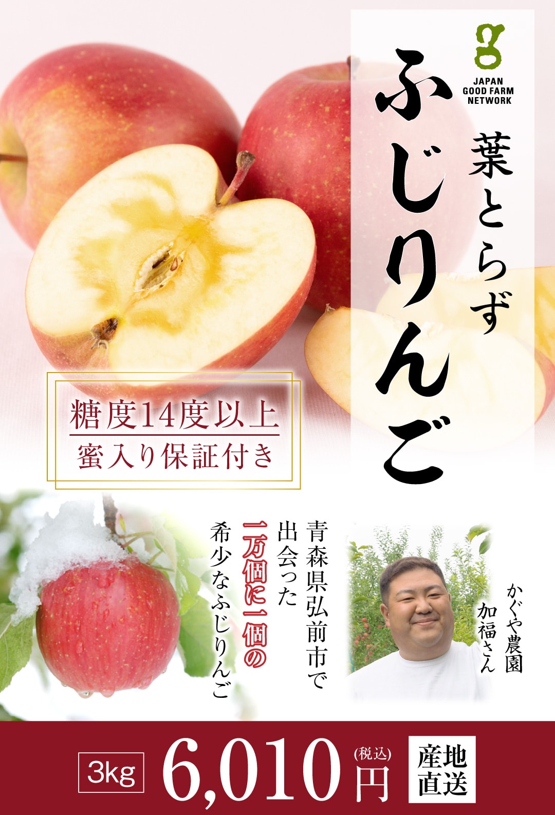 りんごの生産量日本一を誇る青森県弘前市にある「かぐや農園」さんの「特選葉とらずりんご」はギリギリまで樹上に実を成らせる「樹上完熟」の状態で収穫します。さらに、こだわり抜いた有機肥料だけを土に施し、手間暇かけて育てることで糖度は驚きの14度以上!!(ふじりんごの糖度は10度~12度が平均と言われています)リンゴ箱を開けた時にふわっと香る甘い香りは感動です!