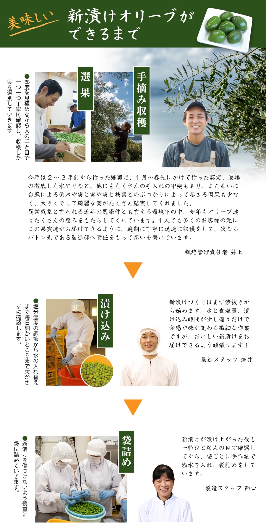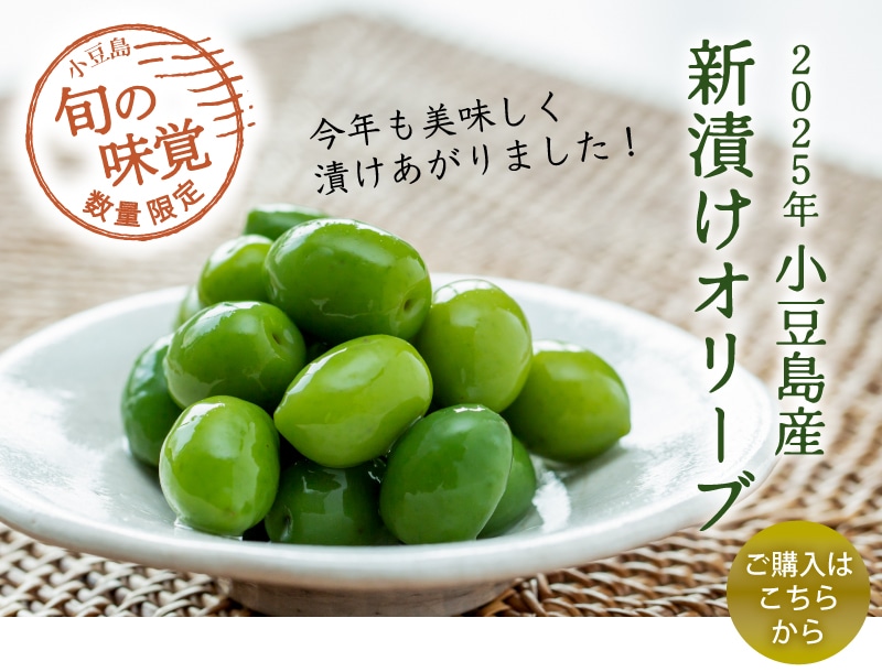 わずか数週間しか収穫できない緑の若いオリーブ果実を、渋抜きして塩水で約一週間漬け込んだオリーブの浅漬けです。 年に一度、収獲の季節にしか味わえない小豆島の秋の味覚として多くの方に親しまれています。 オリーブ果実本来の美味しさが味わえる「新漬けオリーブ」は、品種による風味や食感の違いもお楽しみいただけます。 おかずの一品に、料理の具材やトッピングに、お酒のお供に、ちょっとした手土産にもおすすめです。